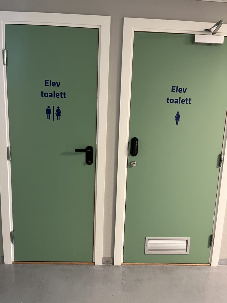 I disse dager kommer det skilter på dørene i bygget, så nå skal det bli lettere å finne fram, blant annet til toalettene.